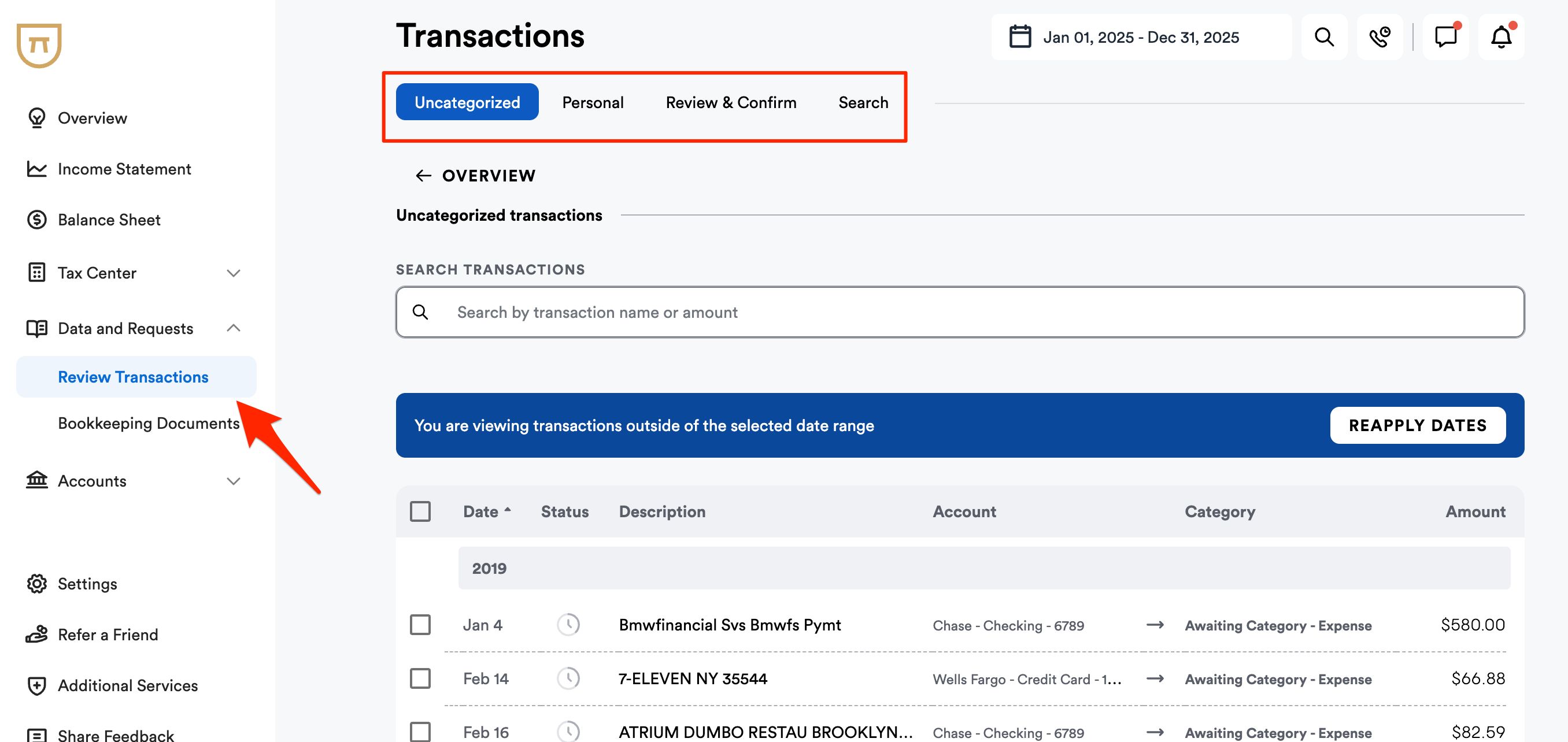 - Or, you can navigate to Data and Requests -> Review Transactions. ‘Transactions’ from ‘My Books’ in the main menu and click on ‘Uncategorized Transactions’