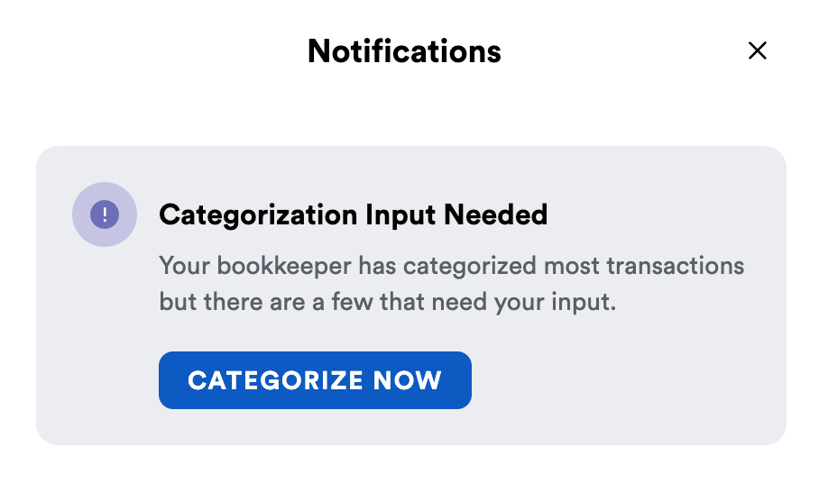 After your bookkeeper has completed an initial review and categorization of your transactions, you may receive a notification to categorize transactions that require your insight.