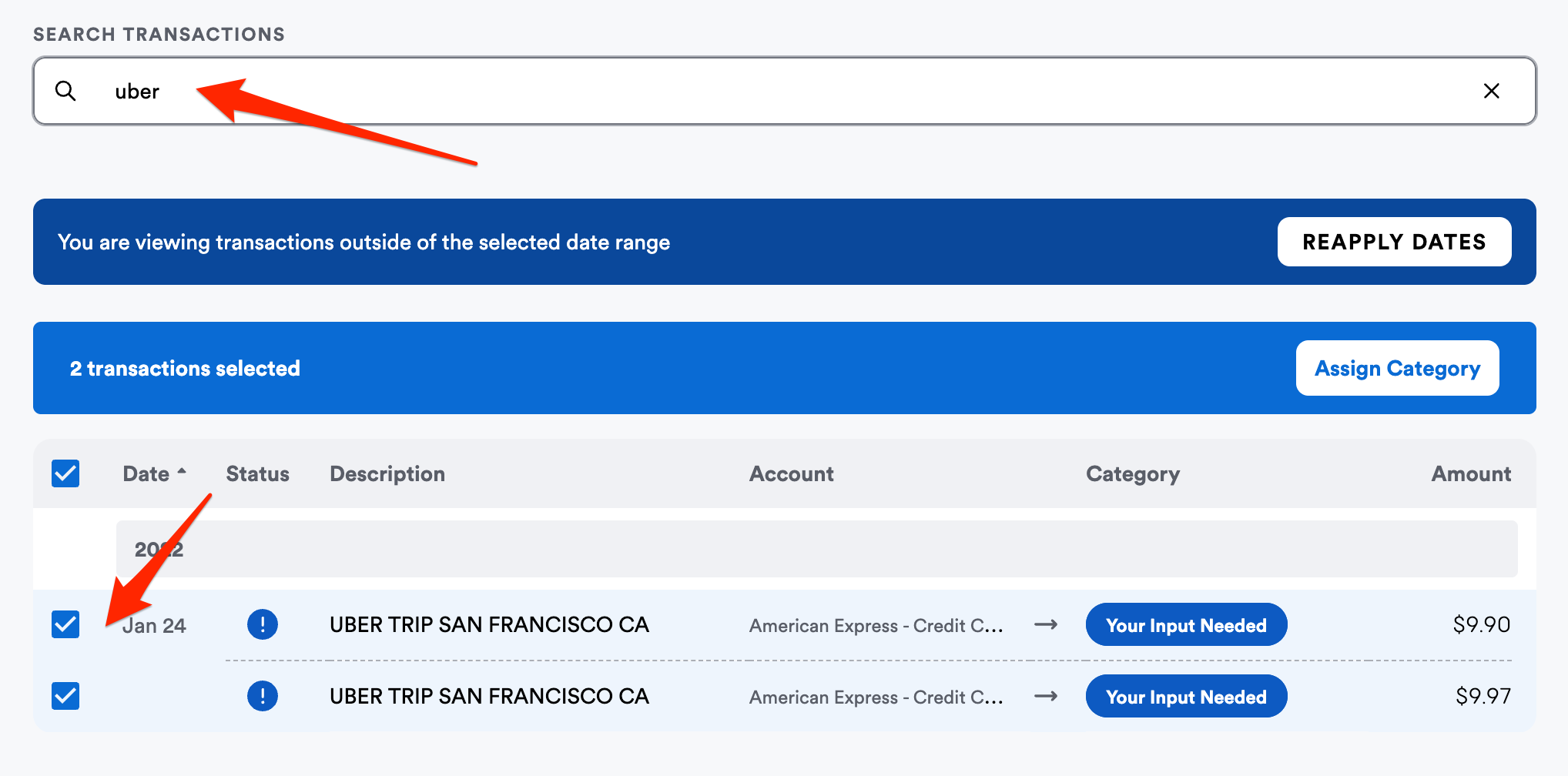 Note: Use the search bar to find similar transactions and efficiently categorize together. You can also sort columns by date, description, or amount.