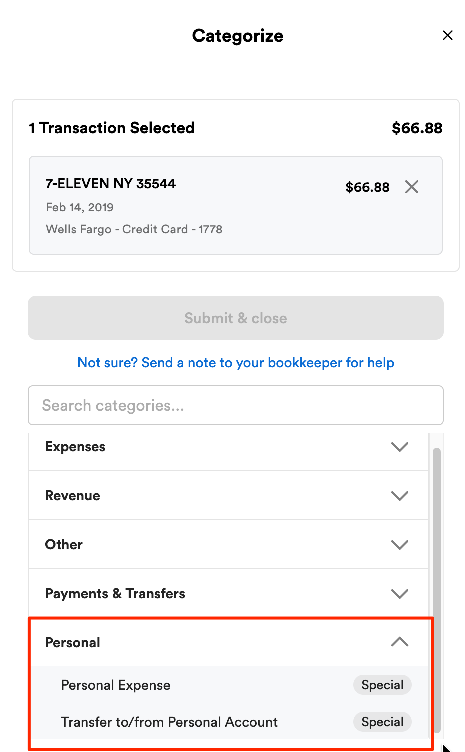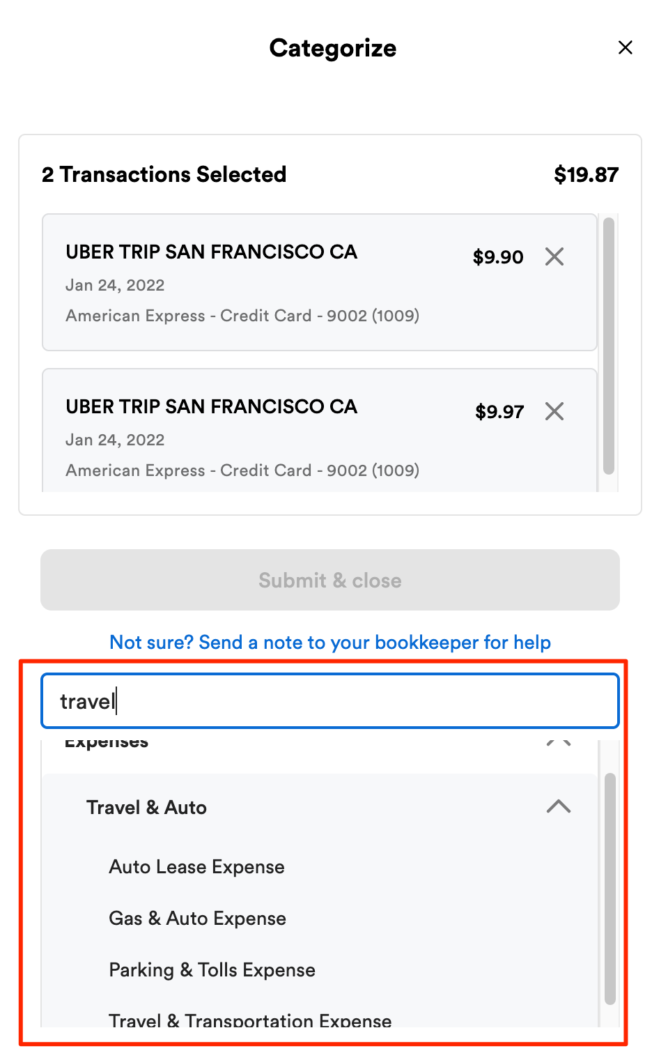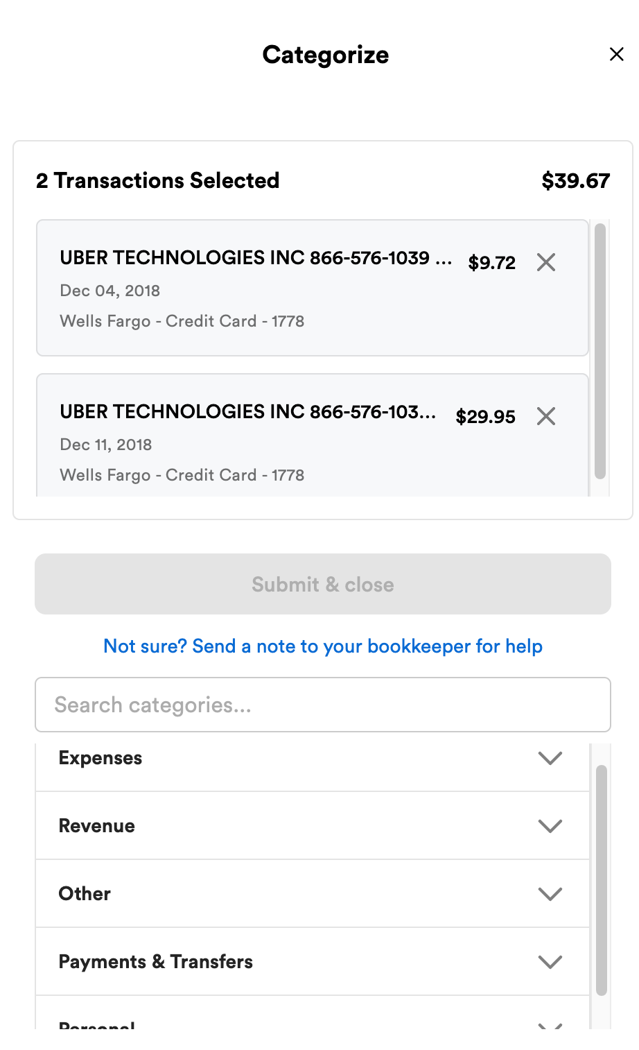 If you are unable to find an applicable category, you can submit a note for your bookkeeper to complete the categorization.